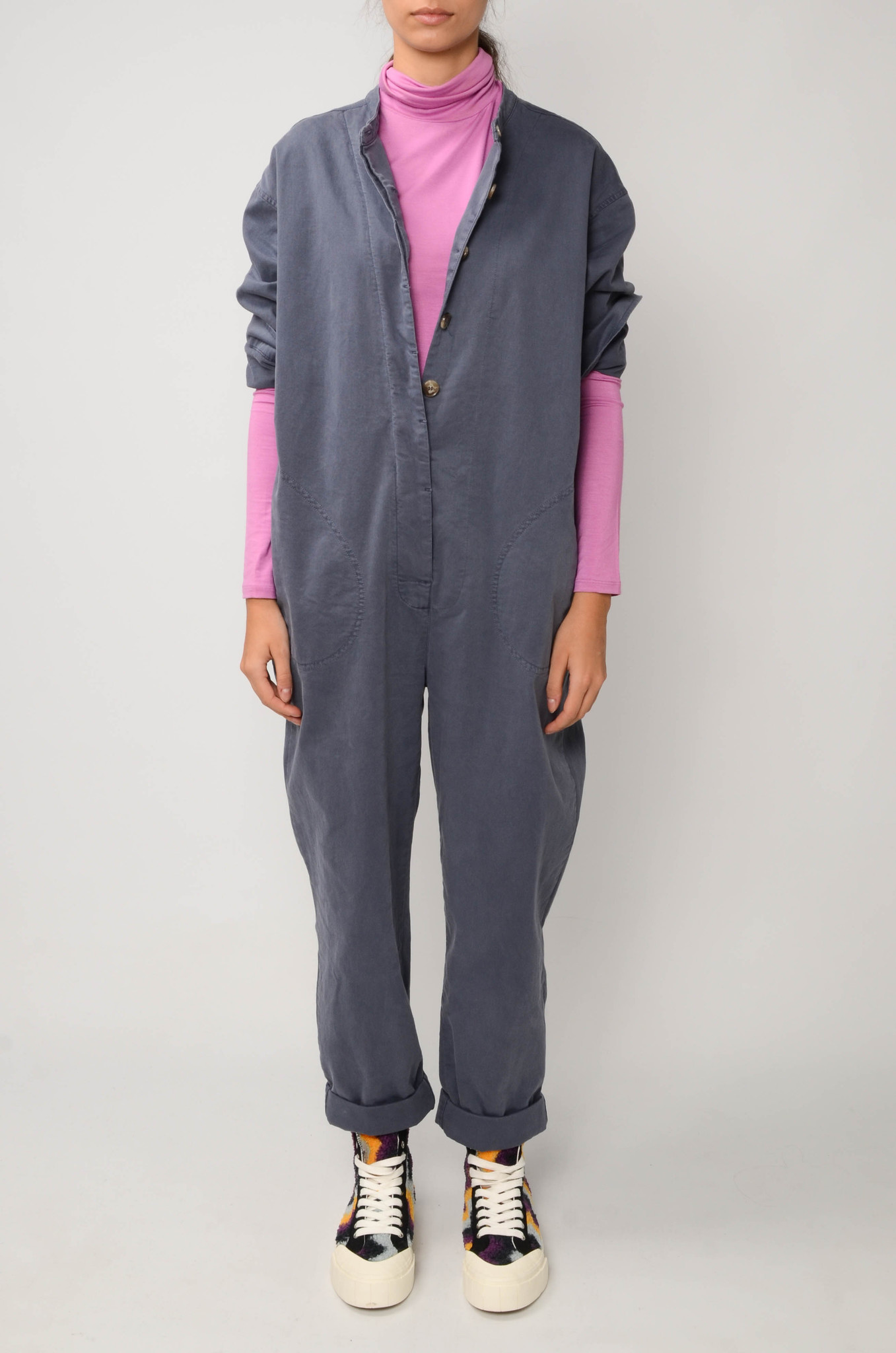 Loose, relaxed fit boiler suit with front buttons, relaxed rolled-up legs and a round neck.